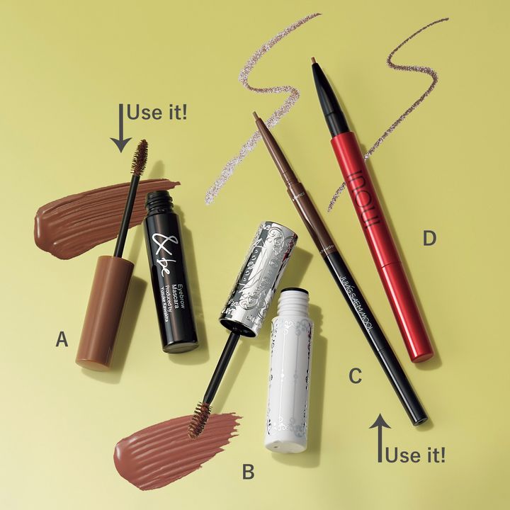 A:色も質感も地眉と好相性。&be アイブロウマスカラ モーブブラウン ¥1,320(Clue)B:柔らかい印象に。ジルスチュアート ムースブロウマスカラ 15 ¥2,420(ジルスチュアート ビューティ)C:一本ずつ描ける極細芯。JUNG SAEM MOOL アーティスト ブロウ シェイダー スリム テンダーブラウン ¥3,080(D-Neeコスメティック)D:ふんわり仕上げたい眉に。インウイ アイブロウペンシル 02 ¥4,180※セット価格(資生堂)