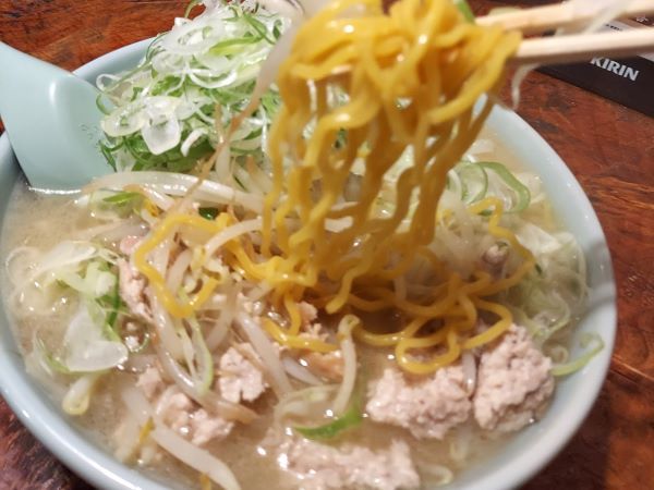 森住製麺のぷりぷりとした黄色い中太ちぢれ麺に甘めのスープがよく絡む。