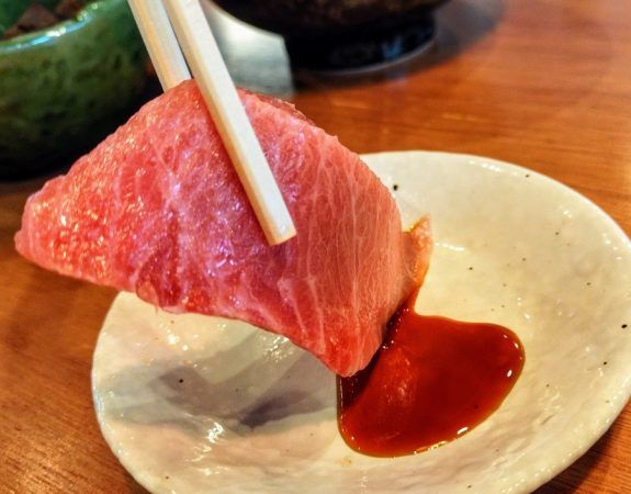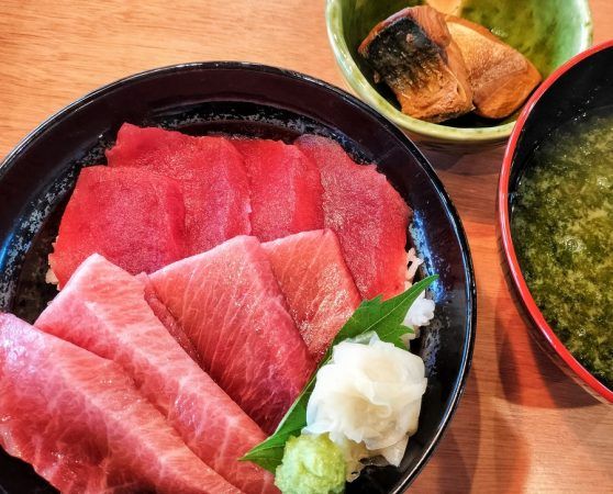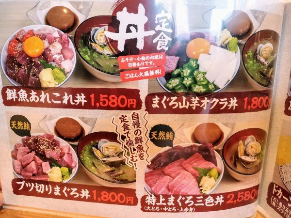 これは絶対食べたい!とオーダーしたのが特上まぐろ三食丼(2580円)。天然まぐろの大トロ、中トロ、上赤身の豪華3点盛りです!