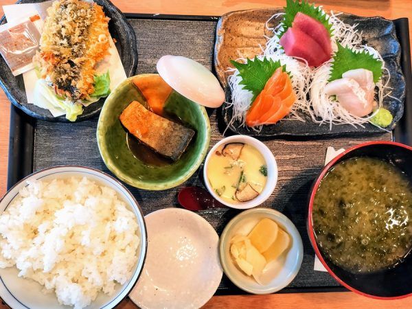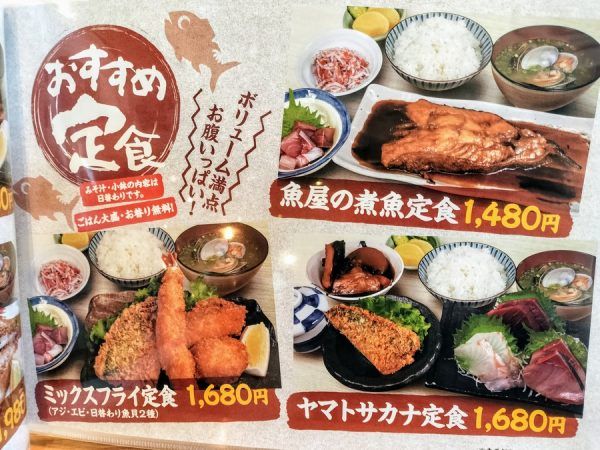 ヤマトサカナ定食(1680円)はアジフライ、煮魚、刺身に茶碗蒸しも付いた欲張りな定食。メニューに迷ったらまずこちらを注文するのがおすすめです。