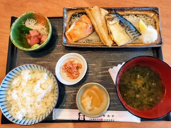 ミックス焼き魚定食(1480円)は鮭、ホッケ、サバの3種類の焼き魚に小鉢も付きます。あおさの味噌汁は磯の香りがしてほっとするおいしさです。