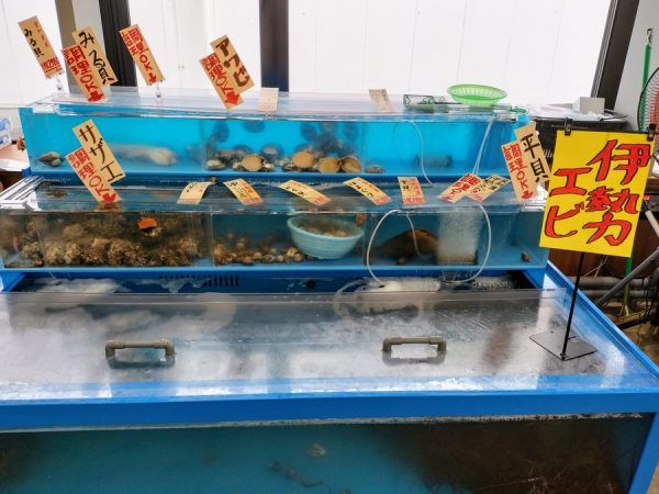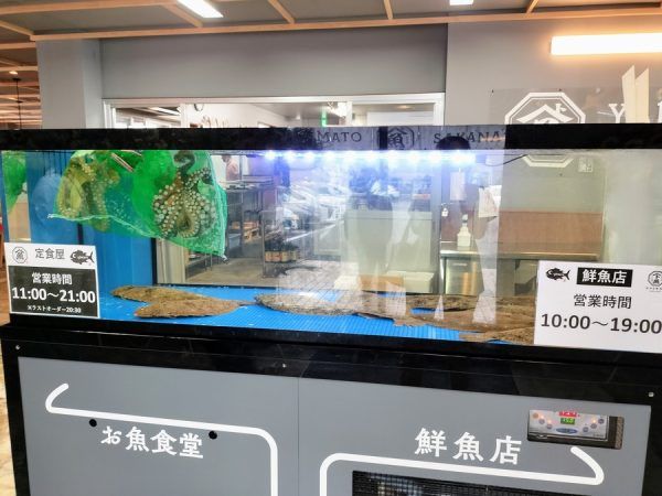 店内入るといきなり大きな水槽がお出迎え! 右側が鮮魚店、左側が食堂エリアになります。 営業時間は鮮魚店が10:30~19:00(8/22より)、食堂は11:00~21:00となっていますのでご注意を。