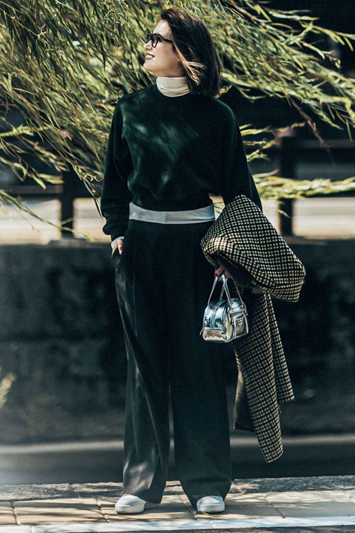 2日目はタートルINでイメチェン。ダークカラーの着こなしに白を挟んでメリハリアップ。コート¥126,500(エイチ ビューティ&ユース)スウェットトップス¥13,200スウェットパンツ¥14,300(ともにステュディオ アール スリーサーティー)タートルニット¥19,800(ユナイテッドアローズ/ユナイテッドアローズ 渋谷スクランブルスクエア店)パンツ¥26,400(イウエン マトフ/ユナイテッドアローズ 渋谷スクランブルスクエア店)バッグ¥36,300(クリスチャン ヴィラ/ハウント代官山/ゲストリスト)メガネ¥80,300(マイキータ/マイキータ ジャパン)。