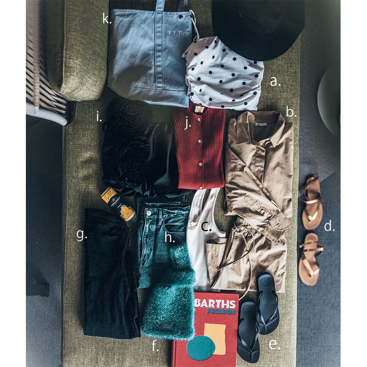 【a.キャミ型水着】水着はキャミ感覚で合わせやすいタンキニやワンピースタイプを。モノトーンがコーデしやすい。※ボトムとセット¥31,900(ミコモリ)【b.シャツ&ショーパン】シャツを羽織りにしたり、ルームウェアとして活用したりと万能セット。シャツ¥5,290ショートパンツ¥4,390(ザラ/ザラ ジャパン)【c.タンクトップ】1枚でも、シャツやカーデのインナーとしても使える白タンク。タンクトップ¥7,480(ステュディオアール スリーサーティー)【d.キレイめサンダル】ゴールドでラグジュアリーブランドのショップやホテルのダイニングなど、キレイめスポットにも対応。¥5,990(ザラ/ザラ ジャパン)【e.ビーサン】マストアイテムのビーサン。使い勝手がいいのは、どんな着こなしにもハマる黒。¥2,750(イパネマ/シード コーポレーション)【f.ミニBAG】観光地巡りやディナーなどちょっとしたお出掛けにあると使えるミニバッグ。¥6,930(メゾンスペシャル/メゾンスペシャル 青山店)【g.ベアトップワンピ】ベアワンピを堂々と着られるのも南国リゾートの醍醐味。デニム素材ならドレッシーになりすぎない。¥8,590(ザラ/ザラ ジャパン)【h.スリムデニム】プールサイドやホテルで着るデニムはきちんと見えるストレートシルエットで。¥16,500(ニードバイヘリテージ/ゲストリスト)【i.ベアトップ】日本で着るのは勇気がいるベアトップこそ着たい。ベアトップ¥5,990アクセ¥2,499(ともにH&M/H&M カスタマーサービス)【j.リブカーデ】コンパクトなカラーカーデはワンピにもパンツにも合わせやすいキラーアイテム¥69,300(ジュウ ジュウ/ロンハーマン)【k.キャンバストート】街でも浮かないキャンバスバッグ。ぺたんこになるから嵩張らない。¥6,050(サロン アダム エ ロペ/ジュンカスタマーセンター)