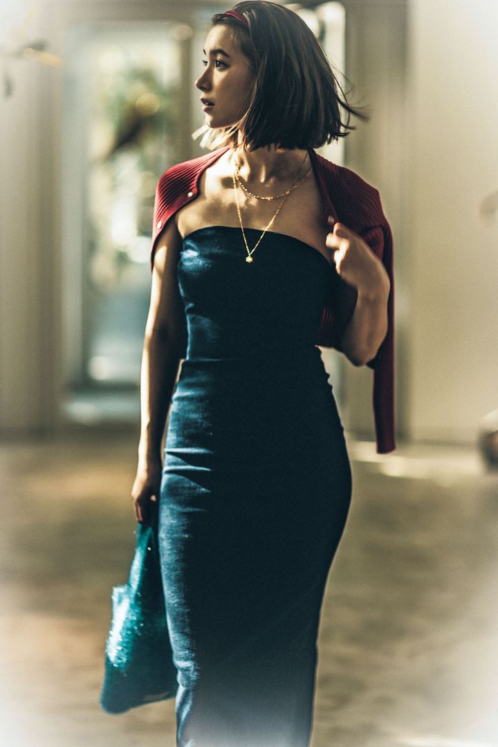 ドレスアップしたい最終日ディナーには、ネックレスでひと盛り。ボディコンシャスなシルエットも気張って見えないのは、インディゴデニムの成せる技。真っ赤なカーデを加えて華やかさに印象アップ。ワンピース¥8,590(ザラ/ザラジャパン)ヘッドアクセ¥4,400(ジェニファー オーレット/ロンハーマン)ネックレス¥26,400ロングネックレス¥24,200(ともにマリア ブラック/マリア ブラック 表参道店)
