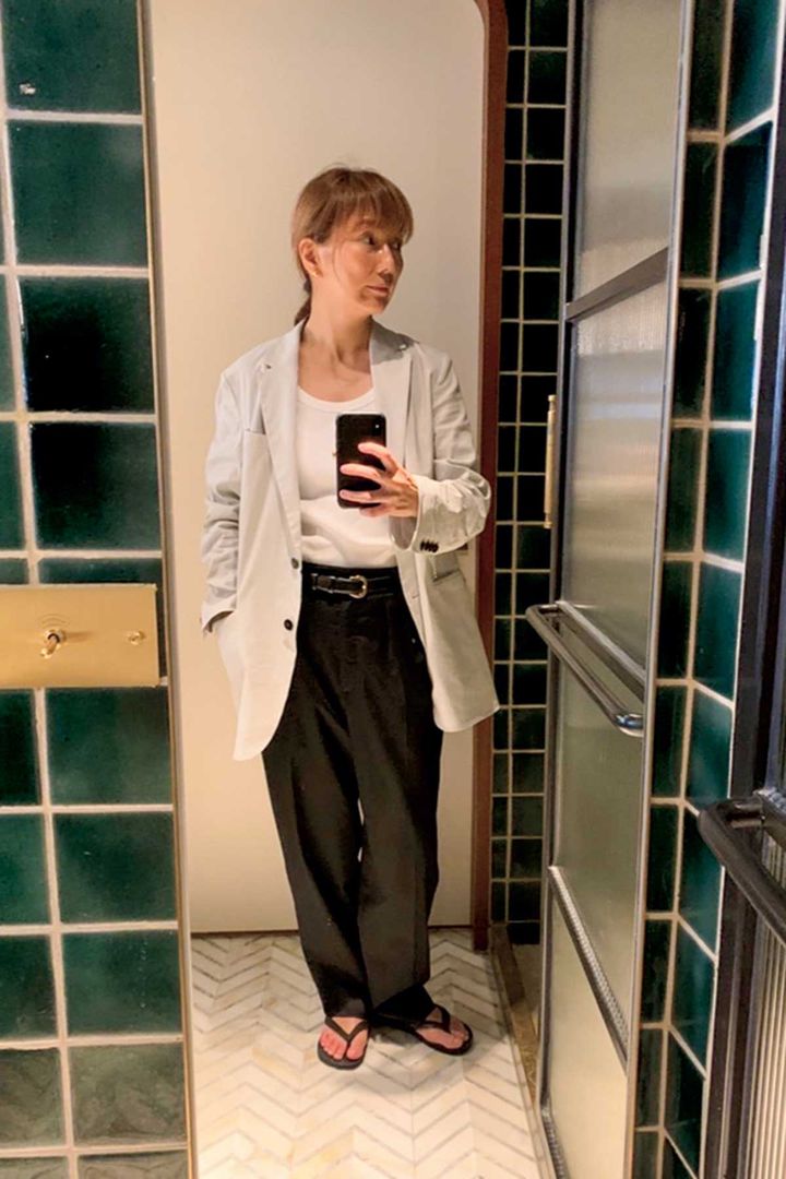 「ひとり旅では電車にも乗るし、観光、ショッピングと、とにかく歩き回るのでビーサンが定番。ジャケットならラフな足元でもきちんと感をキープできます。ひとりの旅こそ、ちゃんと見られたいから、空港のチェックインから着ていきます。」
