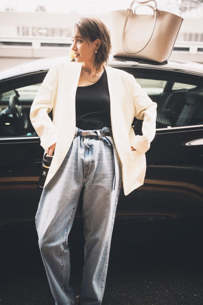 ジャケット1枚だと寒い場合は、大判ストール感覚でゆるカーデを投入。首に巻いたり、ジャケットを脱いで羽織ったりと万能で、寒暖差にも対応。足元はソックス×サンダルで。ジャケット¥86,900(サクラ/インターリブ)タンクトップ¥8,800(イウエン マトフ/ユナイテッドアローズ 渋谷スクランブルスクエア店)カーディガン¥30,800(ウィム ガゼット/ウィム ガゼット ルミネ新宿店)パンツ¥19,910(リネイヴ/オン ワード樫山)ソックス[2足セット]¥1,320(ニューエラ)斜めがけバッグ¥66,000トートバッグ¥82,500(ともにコーチ/コーチ・カスタマーサービス・ジャパン)サンダル¥53,900(プリュスバイショセ/ギャルリー・ヴィー 丸の内店)