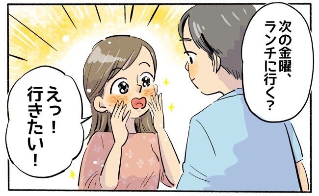 私はその気持ちを夫に特に話したわけではありませんでしたが、ある日、夫から「次の金曜日、仕事の休みが取れたから、一緒にお昼ごはんを食べに行く?」という言葉が。
