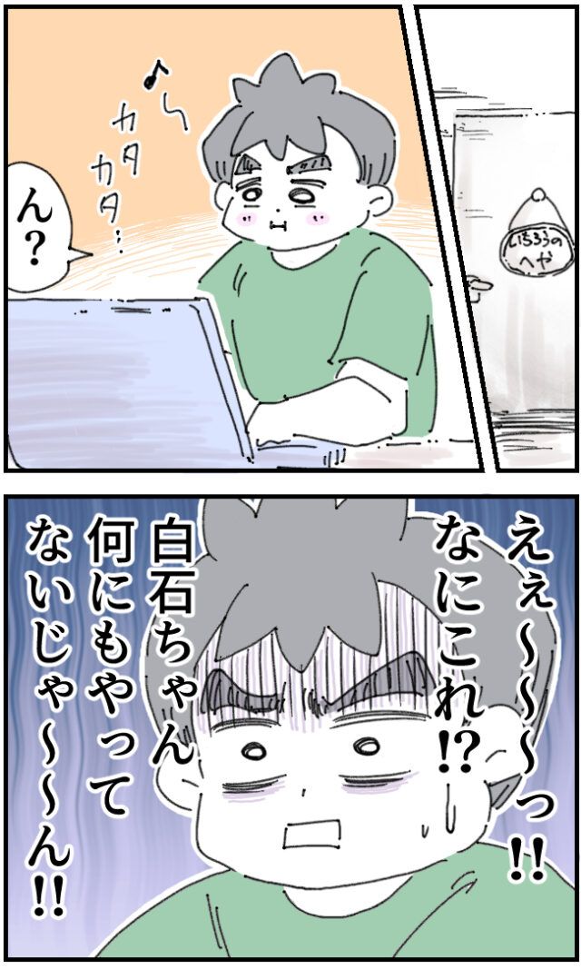 パソコンを開き鼻歌まじりに作業を始めたいちろうさんでしたが、ふと手が止まります。「えぇ~~~っ!!なにこれ!?白石ちゃん何にもやってないじゃ~~ん!!」白石さんから手渡されたUSBに入っていたのは、ほとんど手つかずの状態の資料だったのです。