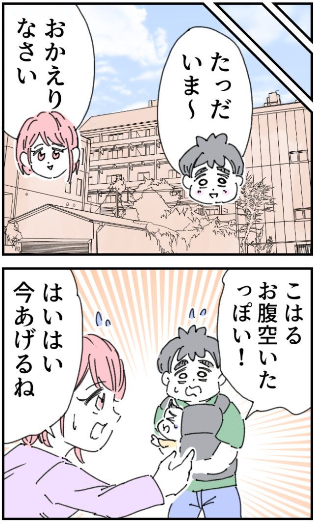 「たっだいま~」こはるちゃんのお散歩と称した白石さんとの密会からご機嫌で帰宅したいちろうさんは、お腹を空かせて泣き始めたこはるちゃんをかおりさんに託します。