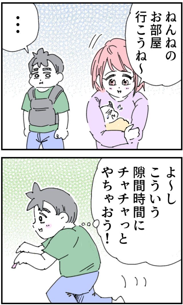 「ねんねのお部屋行こうね~」とかおりさんがこはるちゃんと寝室に向かうのを見送ったいちろうさんは、「よ~し、こういう隙間時間にチャチャっとやっちゃおう!」と先ほど白石さんから引き受けたプレゼン資料作りに取り掛かろうと自分の部屋に向かいます。