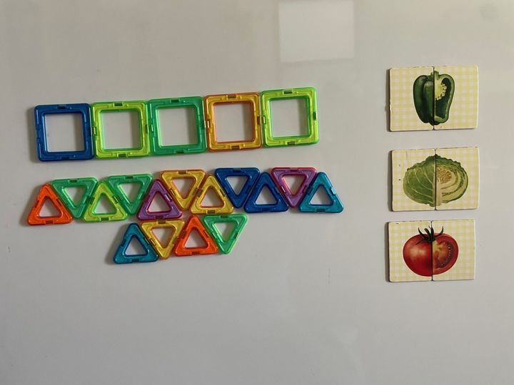 引っ越しをしてからは食卓テーブル脇に大きなホワイトボードを設置しました。お陰でご飯の後はホワイトボードのマグネットを付けたりはがしたりして遊んでいます。ついでに知育も…と思い、100均の野菜カードをステッカーにしました。英語や動物は絵本もあるので、野菜にも興味を持ってくれるといいなと思い作ってみました。(お陰でお肉は嫌いで野菜好きな草食系男子になりました…笑)