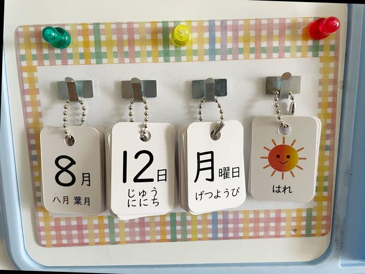 現在通っているベビーパークでは〇月〇日何曜日!と先生が日付のインプットをしているので、気になって日めくりカレンダーを購入しました。通販で気に入った物が売り切れていたのでminneで注文しました。食卓テーブルの脇のホワイトボードにつけているのですが、毎日目に入るのでとても良いです。よく触りたがるのが難点(笑)