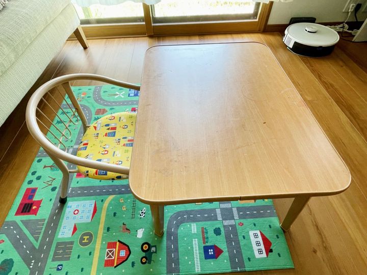 椅子も中古のものですが気に入ってくれた様でおやつを食べるときやクレヨンで遊ぶときは椅子に座ってくれます。リビングにあるのでよく洗濯物を置いてしまいがちで息子が座れなくなるのも困るので、ゆくゆくは場所を変更させたいと思っていますが、とりあえず。