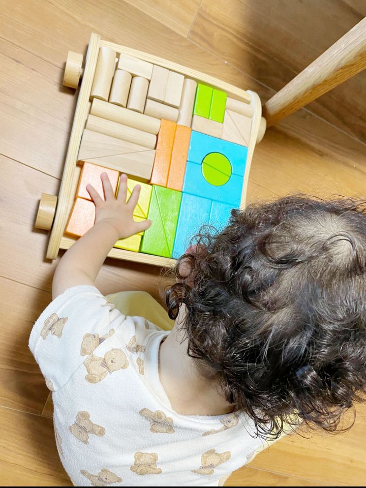 1歳の定番といえばこれ!0歳の時にフライング タイガー コペンハーゲンで購入したものを使用していましたが、いまいち使いづらいのか、積むことが無かったので思い切って木の積み木を購入しました。まだ円柱くらいしか詰めていませんが、少しずつ慣れてくれるといいな~。