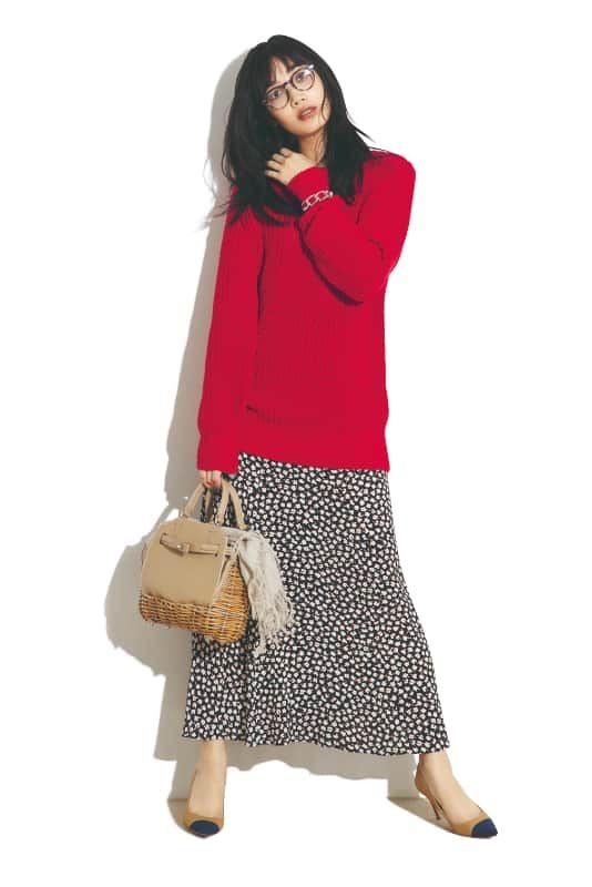 長めの赤ニットで上下にコントラストを出して体型カバー