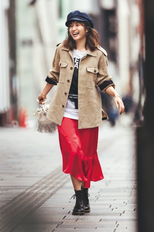 着る人の腕が試される、色も素材も華やかなスカート。CPOやフォトT、マーチンなど、トレンド感のあるアイテムで挟み込む街カジュアルに。スカート¥18,000(イウエン マトフ/ユナイテッドアローズ 青山 ウィメンズストア)ジャケット¥120,000(マディソンブルー)Tシャツ¥21,000(ラ ファム ド キャビン/エストネーション)キャスケット¥10,000(CA4LA/CA4LA ショールーム)バッグ¥142,000(J&M デヴィッドソン/J&M デヴィッドソン 青山店)ブーツ¥24,000(ドクターマーチン/ドクターマーチン・エアウエア ジャパン)ピアス¥18,000ブレスレット¥117,000(ともにチェリーブラウン)