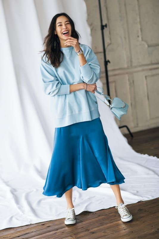 スウェットはデニムよりこんなスカートと着るのがいまの気分!スタイルアップも叶います。スカート¥8,900(ノーク)スウェット¥22,000(カオス/カオス表参道)バッグ¥86,000(ワンドラー/エストネーション)靴¥6,500(コンバース/コンバースインフォメーションセンター)ピアス¥24,000(アズラボ)ブレスレット右手¥3,500(ナカモル/ココシュニック オンキッチュ 有楽町マルイ店)ブレスレット左手¥18,000(イン ムード/フォーティーン ショールーム)