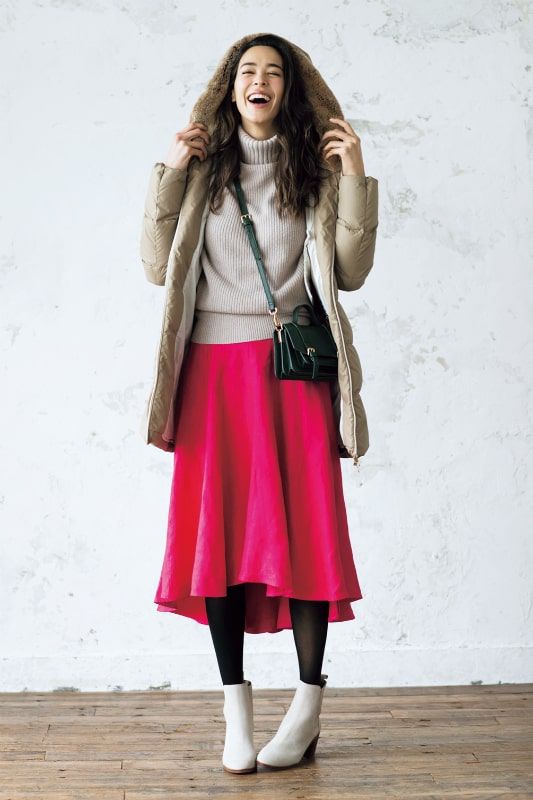 鮮やかなピンクで動くたび揺れるたっぷり生地を使ったフレアスカートははくだけでドラマチック! 主張のあるスカートだからこそ他のアイテムはベージュ一択で。スカート¥71,000(マディソンブルー)コート¥138,000(デュベティカ/F.E.N.)ニット¥18,000(アルアバイル)バッグ¥21,000(サマンサタバサデラックス/サマンサタバサデラックス 新宿高島屋店)靴¥17,182(バナナ・リパブリック)