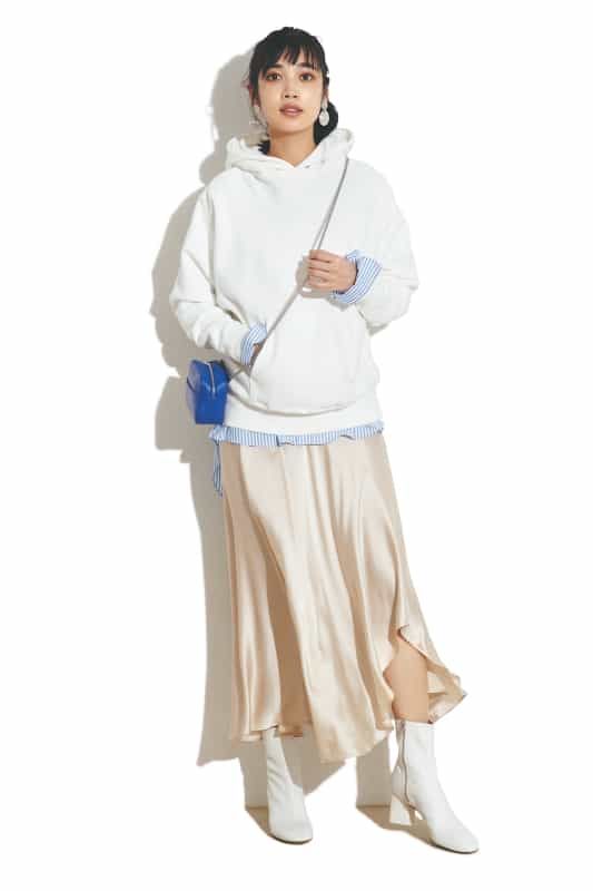ドレーピーかつ立体的な揺れ感が華やかなスカート。フーディにシャツを挟んでお腹周りをカバー。スカート¥58,000シャツ¥20,000(ともにTHIRD MAGAZINE)フーディ¥24,000(エイトン/エイトン青山)バッグ¥85,000(J&M デヴィッドソン/J&M デヴィッドソン 青山店)ブーツ¥66,000(rag & bone/ラグ&ボーン 表参道)イヤリング¥12,000(アビステ)