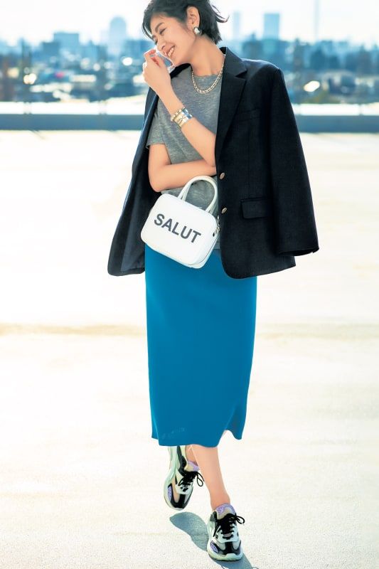 ボリュームのあるダッドスニーカーは、細身のタイトスカートでバランス調節するのが正解。ジャケットも肩掛けでグンとスタイルよく。スニーカー¥34,000(デイト/ティースクエア プレスルーム)ジャケット¥15,000(Mila Owen/Mila Owen ルミネ新宿2店)Tシャツ¥12,000(ハイク/ボウルズ)スカート¥16,000(スタニングルアー/スタニングルアー 青山店)バッグ¥66,000(ミチノ/Pred PR)イヤリング¥6,682ネックレス¥14,319(ともにアビステ)バングル[太]¥29,000[細]¥32,000(ともにノースワークス/UTS PR)