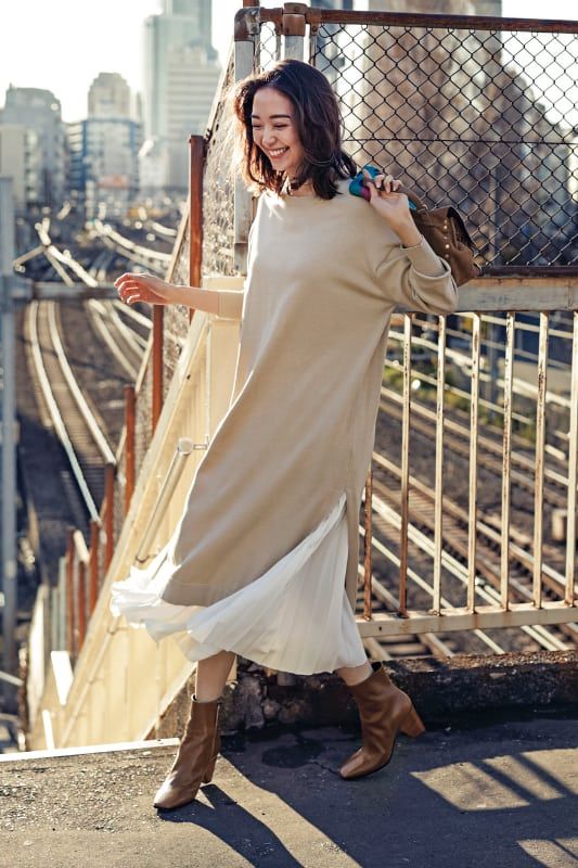 ニットワンピからスカートをちらりと覗かせて、フェミニンな奥行きを