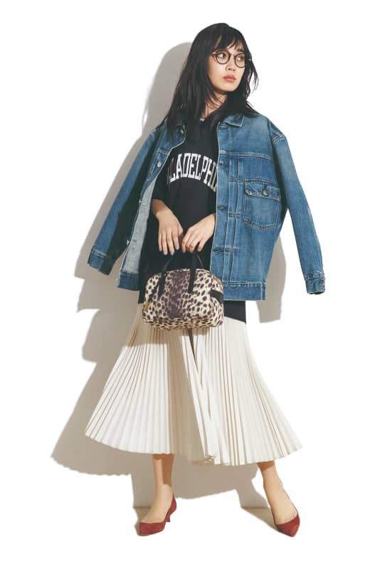 ビッグサイズのトップスでカジュアルにまとめても、白を選べばあくまでもクリーンな印象に。スカート¥35,000(ツル バイ マリコ オイカワ)Gジャン¥38,000(ハイク/ボウルズ)スウェット¥11,000(チャンピオン/フレームワーク ルミネ新宿店)バッグ¥27,000(トフ アンド ロードストーン/T&L)パンプス¥27,000(ルチェンティ/ゲストリスト)メガネ¥33,000(アイヴァン/アイヴァン PR)ネックレス¥16,200(アビステ)