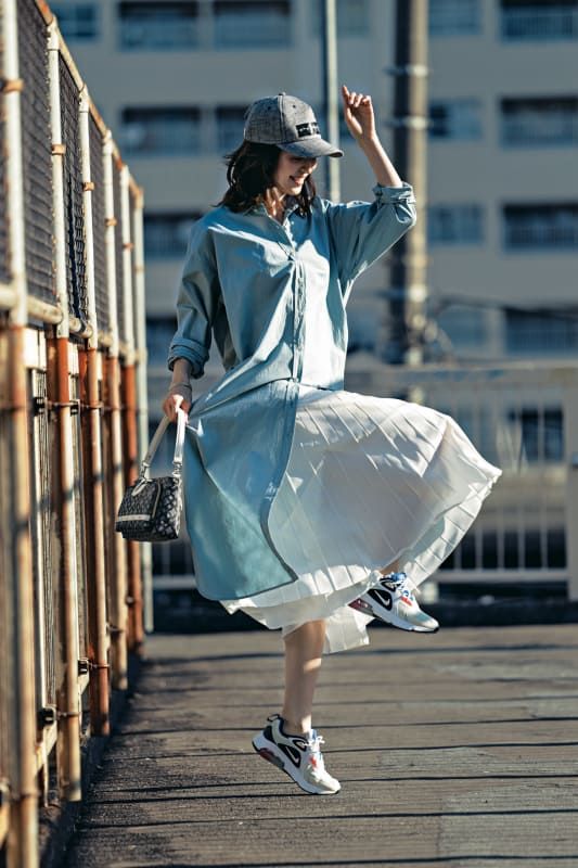コーデにハズしを加えるだけで、全身にハッと目が行くコーデに。スタイルよく見せることができます。スカート¥19,000(エリオポール/エリオポール代官山) シャツワンピース¥18,000(ウォーレン スコットフォー RHC/RHC ロンハーマン)キャップ¥9,800(CA4LA/CA4LA ショールーム)バッグ¥9,800(クリスチャンオリビエ/ステップワン)スニーカー¥12,000(ナイキ スポーツウェア/NIKE カスタマーサービス)バングル¥69,000(WOUTERS&HENDRIX/H.P.FRANCE)