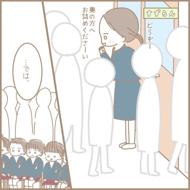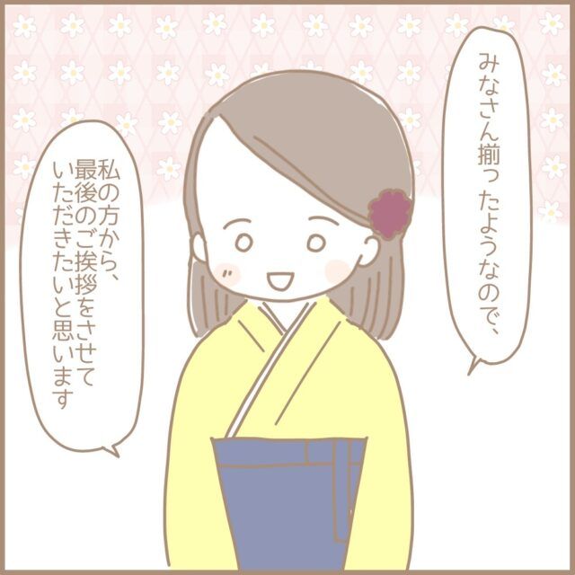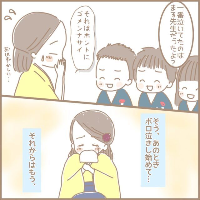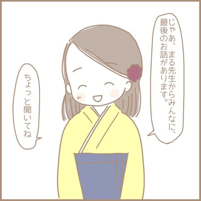 涙で始まり涙で終わった卒園式。たくさん泣いてすっきりしたまるちゃんさんは、落ち着いた気持ちで最後の挨拶に臨みます。担任の先生としてのお仕事はこれが本当に本当に最後ですね。