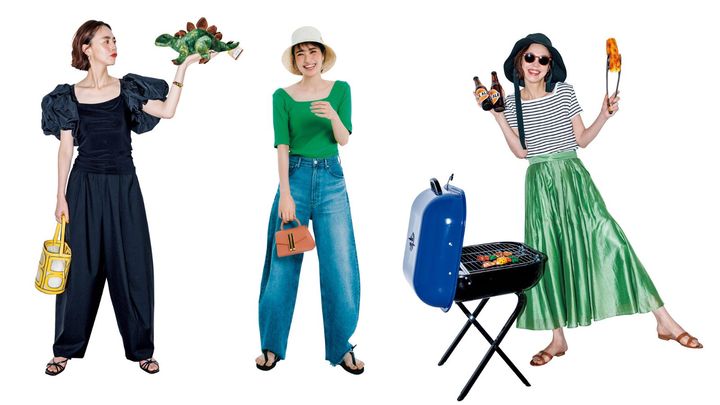 [右]タンクトップ¥12,100(クラネ/クラネデザイン)スカート¥17,600(サロン アダム エ ロペ)キャップ¥6,600(ハチイチブランカ/UTSPR)ピアス¥26,400バングル¥49,500(ともにサラース/サラース カスタマーサポート)バッグ¥18,700(アドカラム/アンソロジー)[左]ノースリTシャツ¥20,900(ハイク/ボウルズ)サロペット¥27,500(カデュネ/カデュネ プレスルーム)ピアス¥44,000(サラース/サラース カスタマーサポート)バッグ¥13,200(アドカラム/アンソロジー)ビーサン¥12,100(スリーパーズ/ロンハーマン)
