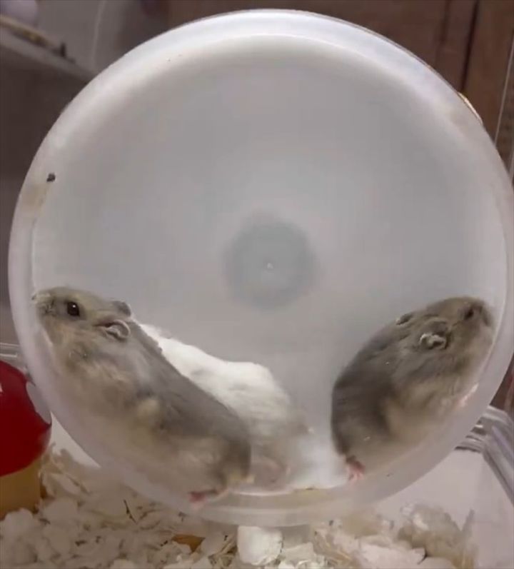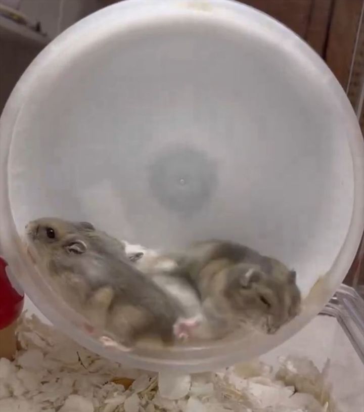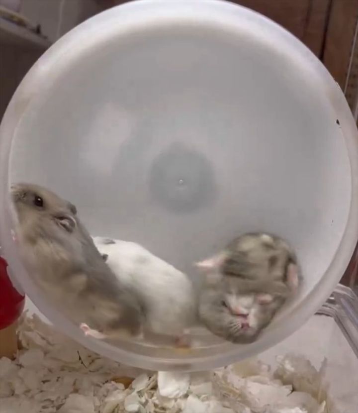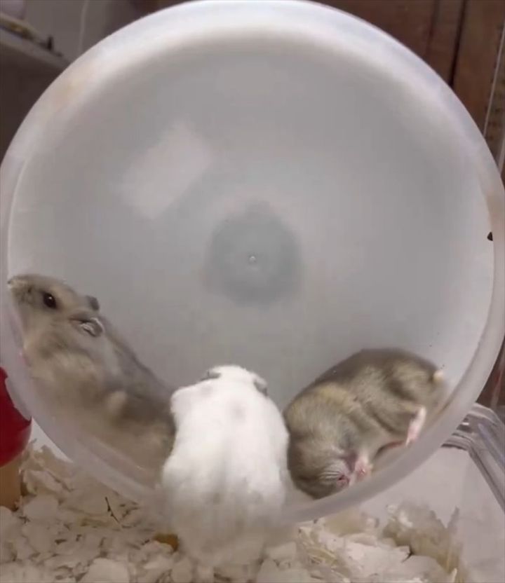回し車にいた2匹のハムスター。 そこにもう1匹が突撃しにいったところ、おもいもよらぬ展開を迎えました!