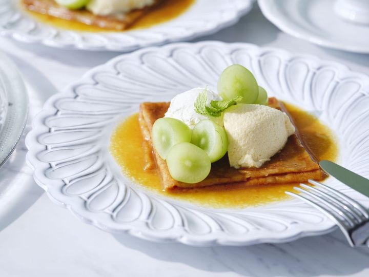 メインデザートには、全粒粉をたっぷり使用したクレープを無花果のソースで煮込み、フレッシュなシャインマスカットとチーズババロアが軽い味わいの「シャインマスカットと無花果のシュゼット」が登場。
