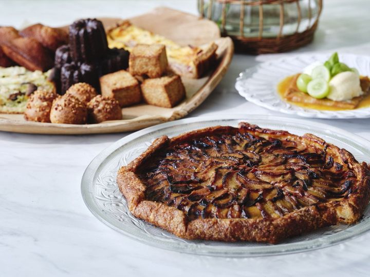 ゲストの目の前まで運ばれるベイクワゴンは、「カヌレ」「シューパリジャン」「季節のフルーツのガレット」「フィナンシェレーヌ」「スコーン」「キッシュロレーヌ」「チキンジェノベーゼのブリオッシュタルト」の全7種類から好みの焼菓子4種類を選ぶことができる。