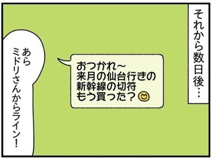 そして、もう1つ楽しみにしていた仙台旅行が間近に迫ってきました。ところが、ミドリさんから急に「別の場所に旅行することに決めた」と、告げられます…。