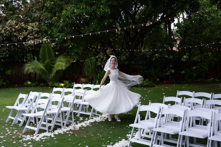 「今回のウェディングは、家族全員を巻き込んで、みんなが喜べる機会にしたかったんです。開放的なハワイの雰囲気もあって、どちらの両親も誓いの後にハグとほっぺにキスをして。びっくりしていたけど、サプライズを楽しんで受け入れてくれました。兄弟や親戚たちも盛り上がってくれたのがうれしかったですね」。