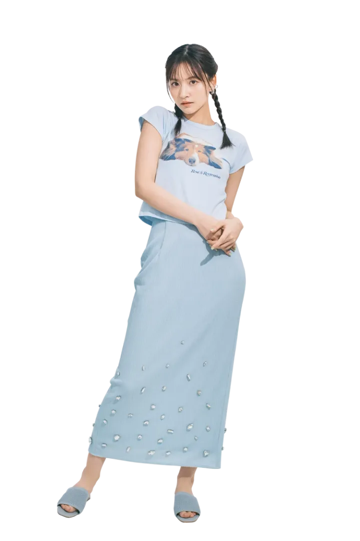 ブループリントTシャツ 8,591円/Rest&Recreation(MUSINSA GLOBAL STORE) ブルービジュースカート 16,500円/rienda(バロックジャパンリミテッド) イヤリング 1,100円/パリスキッズ 原宿店 サンダル 7,920円/RANDA