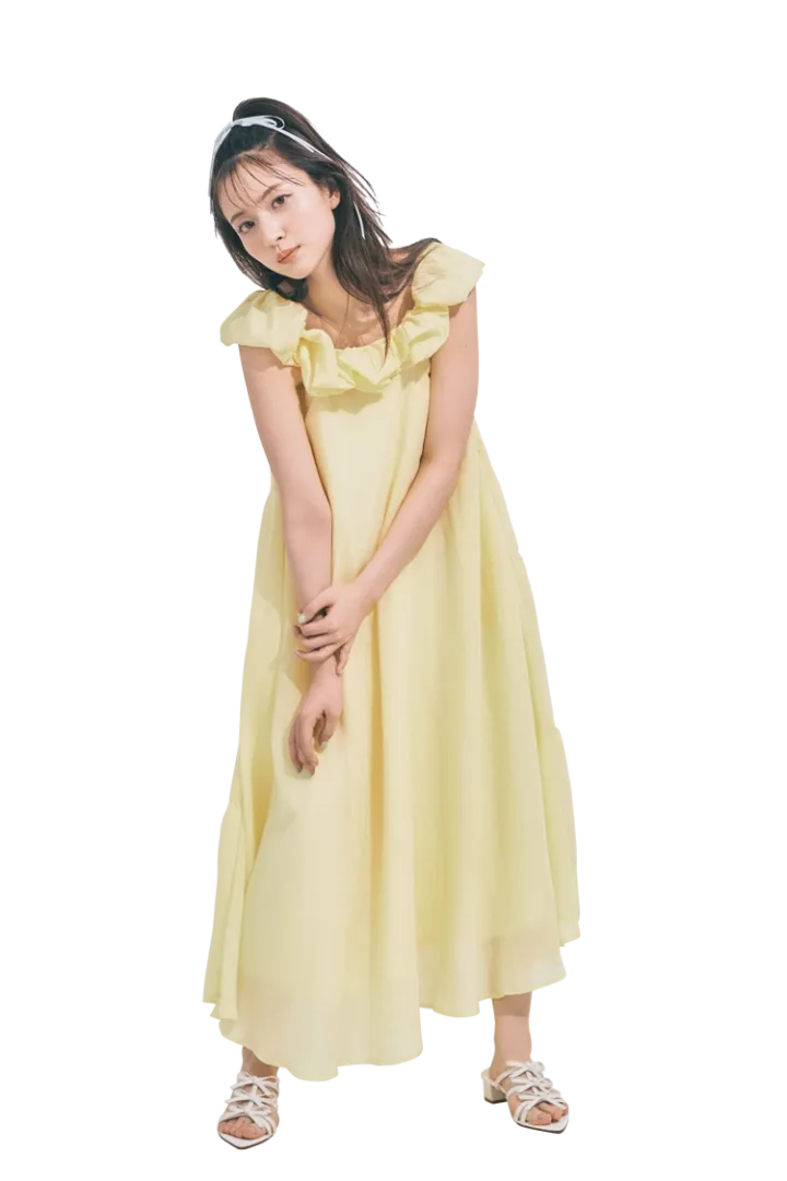 発色のいいイエローが夏気分を高めてくれる♡ デコルテ部分のフリルで顔まわりが華やかに。