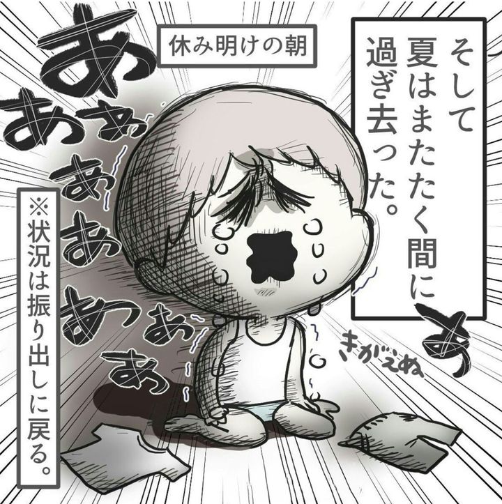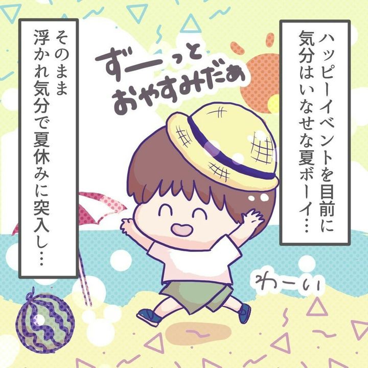 幼稚園でプールが始まり、ワクワクしながら登園するようになった長男。それまで大暴れで乗せられなかった自転車で登園することができ、さぞ安心したことでしょう。プールを楽しんだ後は夏休みに入った長男ですが、夏休みが終わると同時に再び登園拒否が始まってしまうのでした。