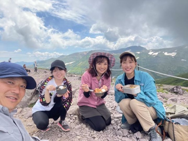 左から同僚のKさん、私・堀内美里、先輩アナウンサーの佐藤彩さん、初登山の同期Aちゃん