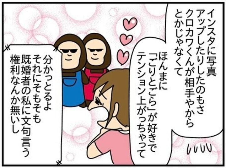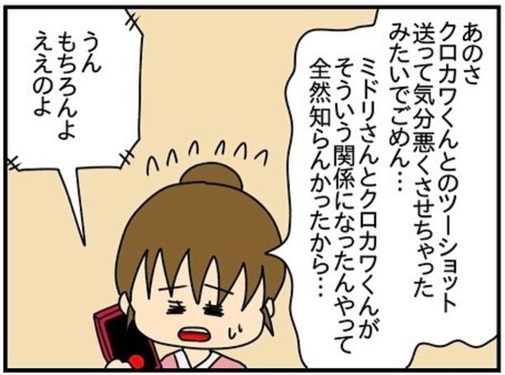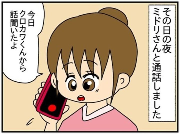 直接、ミドリさん本人にクロカワくんとの関係について尋ねました。今の夫からのモラハラがエスカレートしていると聞き、気の毒に感じた主人公・きよか。ミドリさんに「幸せでいて欲しい」と伝えます。