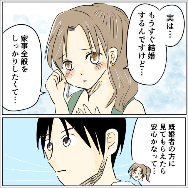 「もうすぐ結婚するんですけど・・・家事全般をしっかりしたくて、既婚者の方に見てもらえたら安心かなって。」