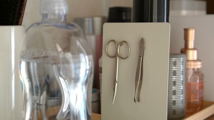 動画内ではダイソーで販売されている強力マグネットを使い、メイクやボディケアで使う金属製の小さなハサミやピンセットを、くっつける収納テクニックも紹介しています。