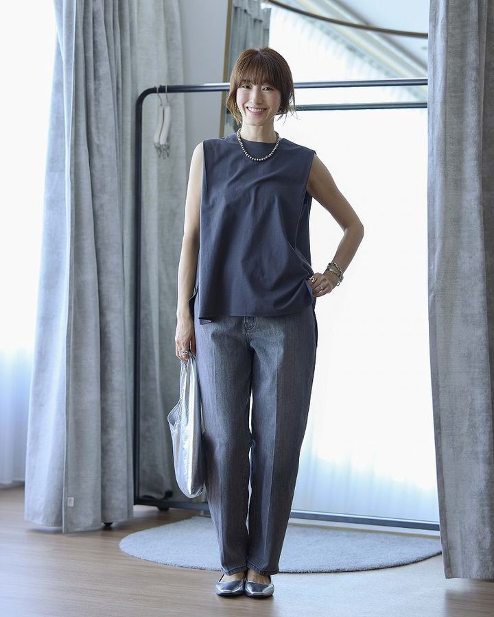ファブリックドッキングノースリーブプルオーバー¥6,990※Mサイズ着用 PLUS STYLEカーブジーンズ¥13,000※Lサイズ着用 スクエアトゥメリージェーン2WAYパンプス ¥9,990※Lサイズ着用(すべてプラステ)バッグ、アクセサリー(ともに私物)