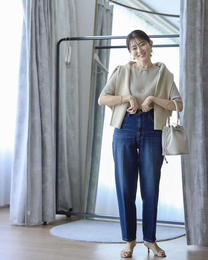 プラステのカーブジーンズは、センタープレスが入っているので、普段きれいめが好きな方におすすめ。前から見るとすっきり見えするのに横から見るとふっくら膨らんだカーブなので、程よく今っぽいシルエットになりつつ、きれいめをキープしてくれます。ピッタリなトップスをインして、カーブのシルエットを楽しんだコーデにしてみました。