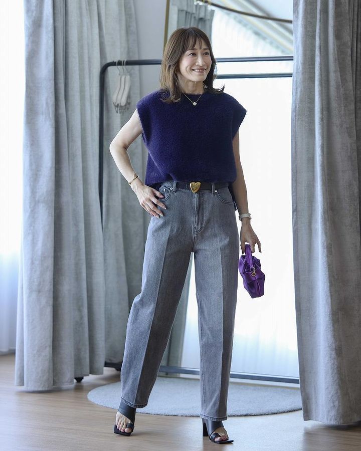 フェザーヤーンボクシーベスト¥7,990(8/26発売予定)※Lサイズ着用 PLUS STYLEカーブジーンズ¥13,000※Mサイズを着用 (ともにプラステ)ベルト、バッグ、サンダル(すべて私物)