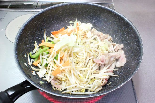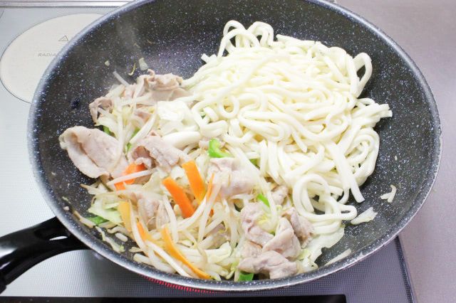 袋から出したうどんは麺どうしが引っ付いていましたが、水は加えず。野菜から出た水分をまとわせ、3分ほどかけてほぐしながら炒めました。
