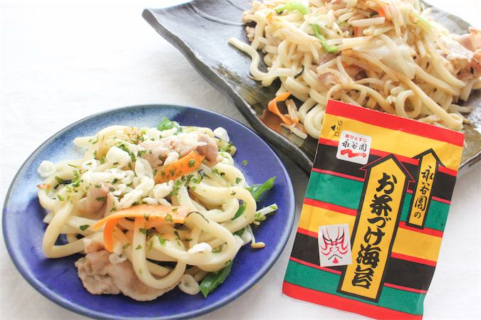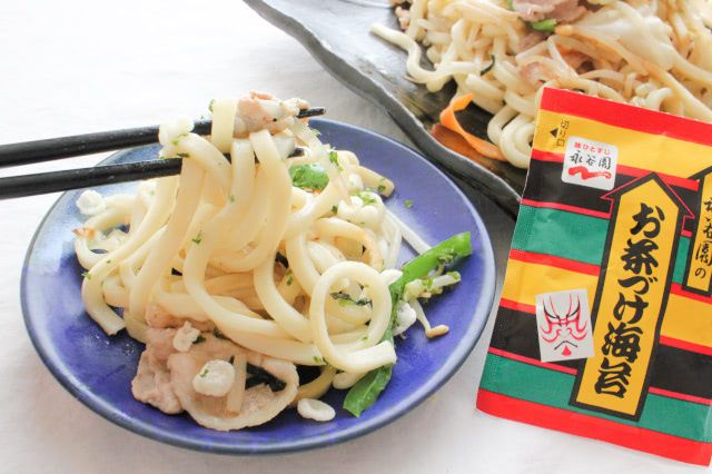 お茶漬けの素に入っていた、細長いあられやのりが所々に見えるところも、普段作る焼きうどんとは異なりますね。