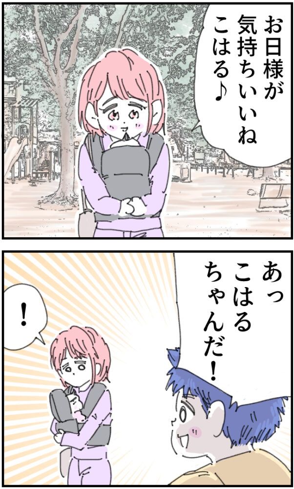 かおりさんがこはるちゃんと公園に散歩に出かけると、見知らぬ男の子がこはるちゃんを見て「あっこはるちゃんだ!」と笑顔で駆け寄ってきました。