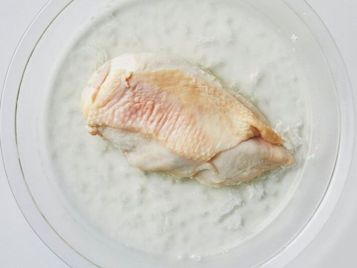 ・鶏肉はラップをかぶせ、厚みのある部分をげんこつで50回ほどたたいて柔らかくする。耐熱皿にのせ、下味の材料をもみ込む。