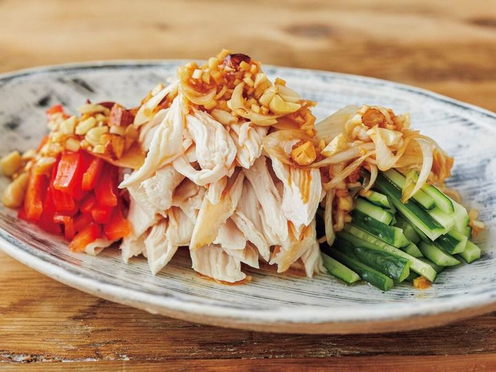 (2)ラップを外して肉の上下を手早く返し、新しいラップをぴっちりとかける。そのまま10分ほどおき、余熱で火を通す。耐熱皿の中で、食べやすくほぐす。 (3)器に蒸し鶏、きゅうり、パプリカを盛り、たれをかける。